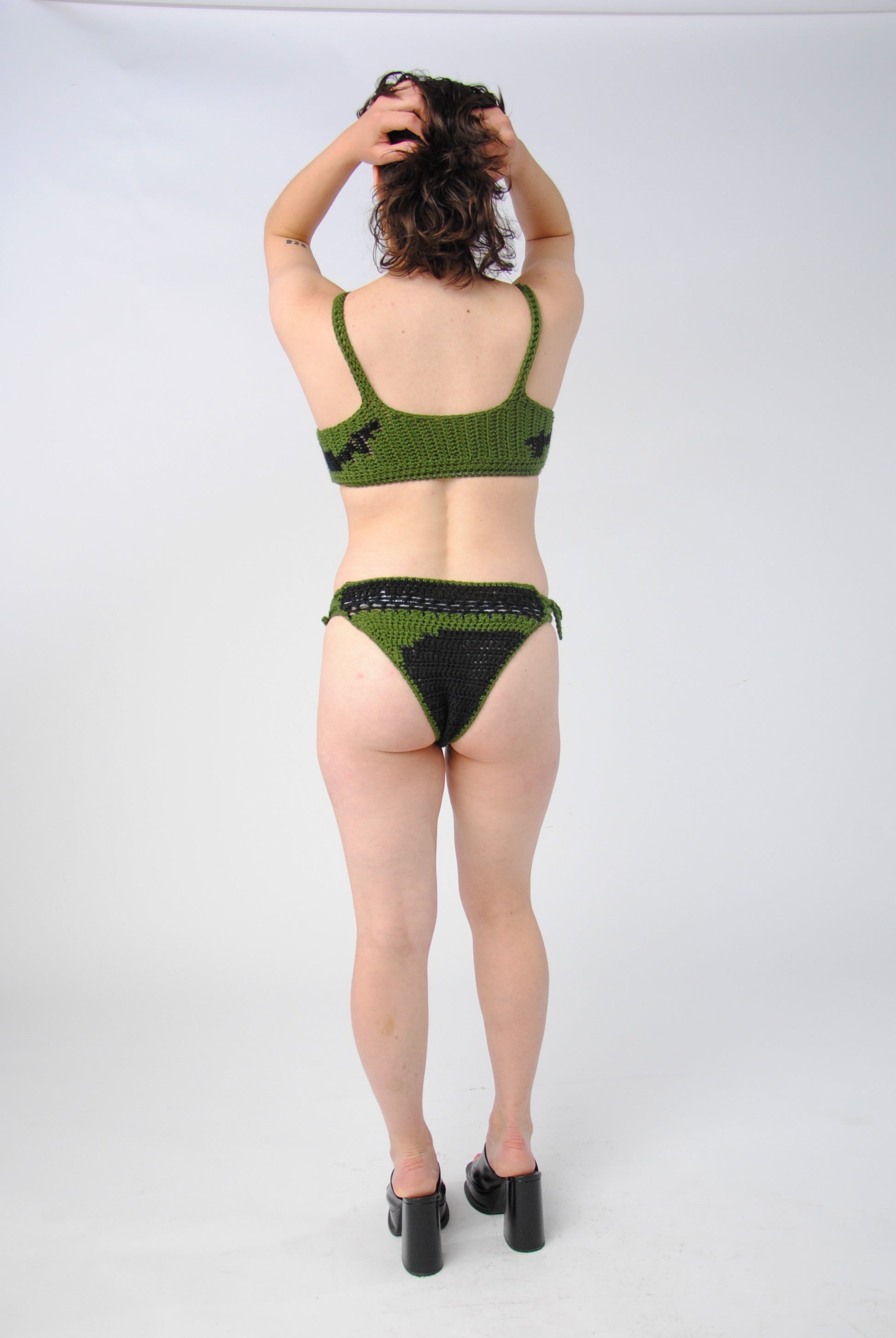 It ties at the front and has an elastic at the lower part of the bikini to keep everything tight