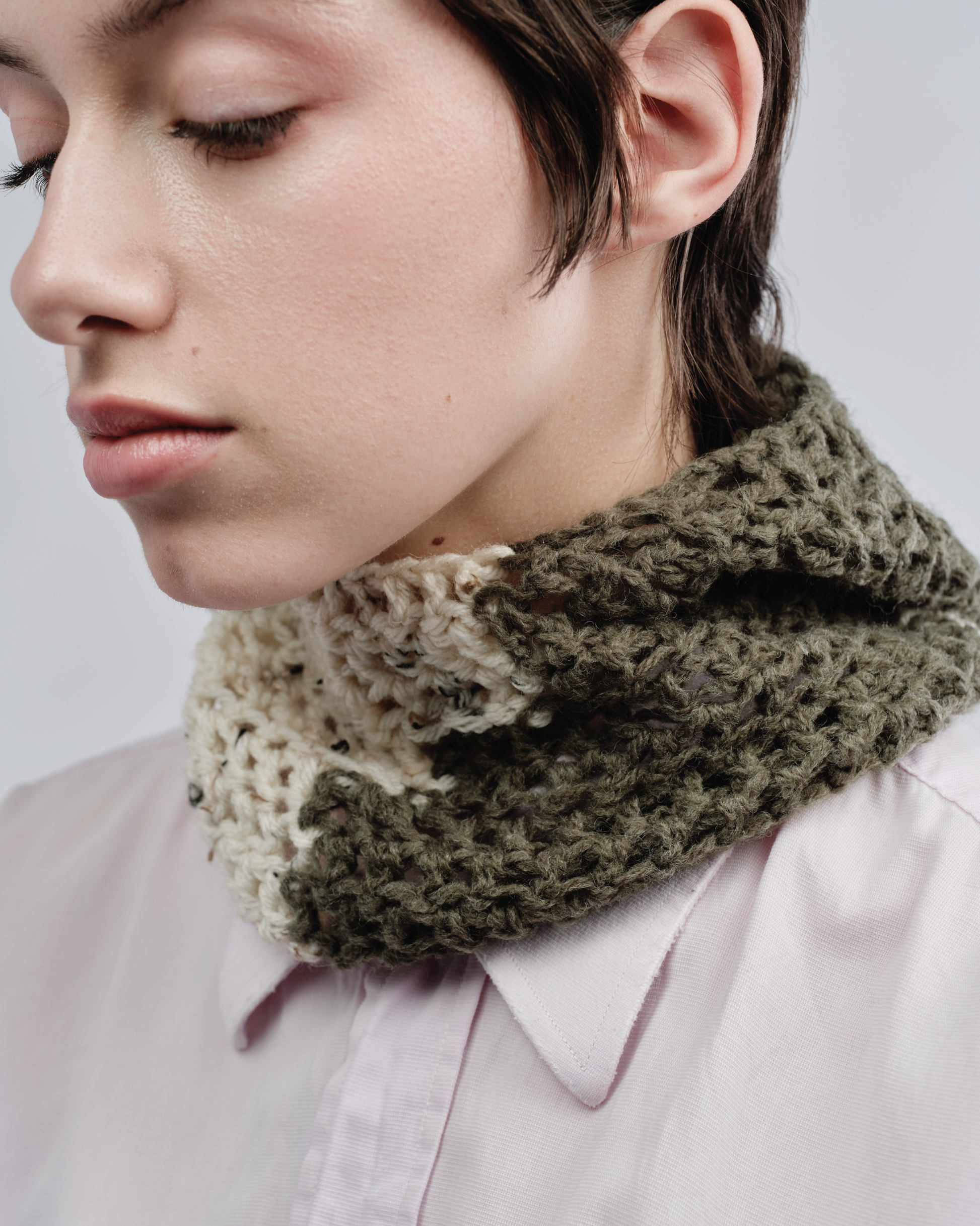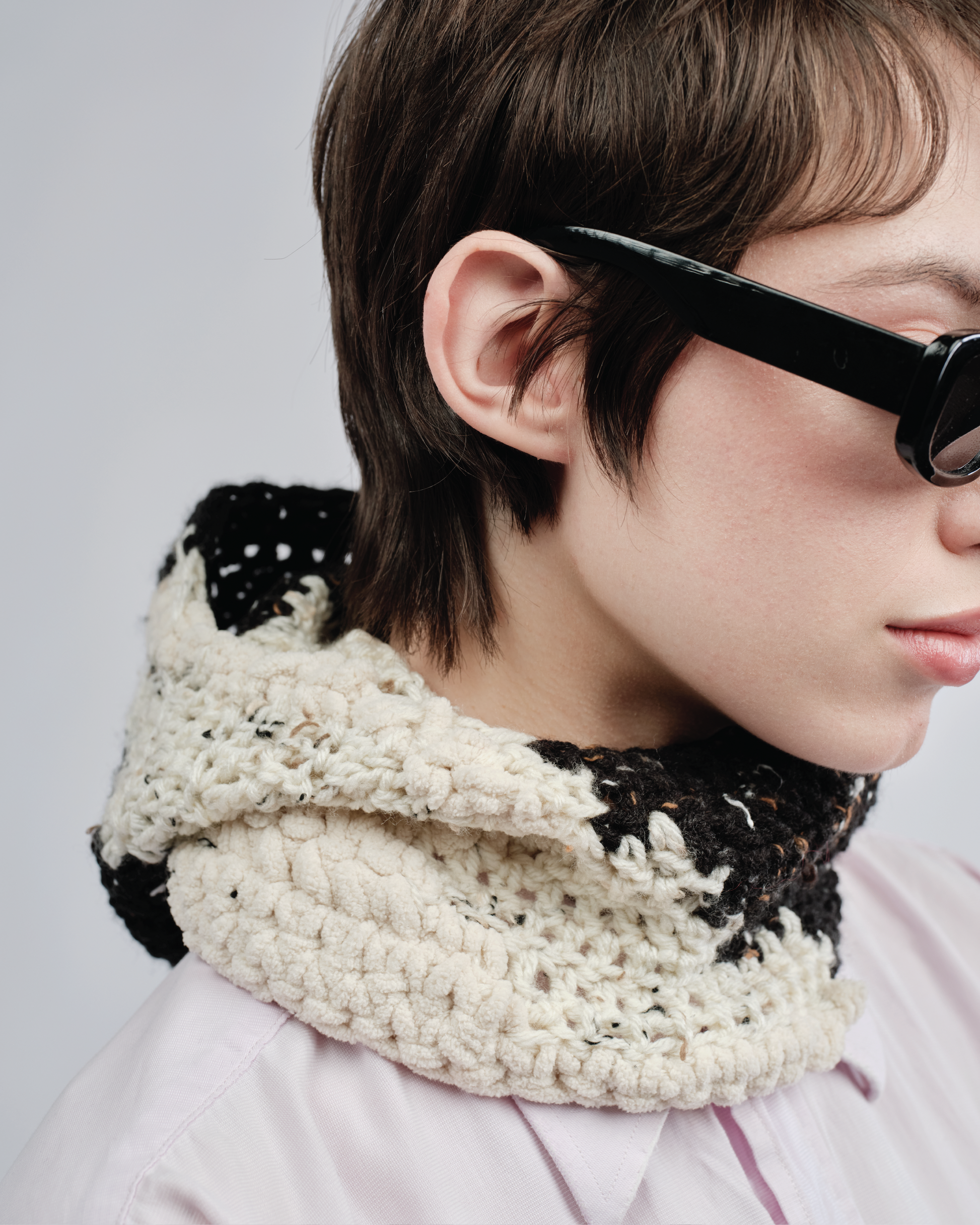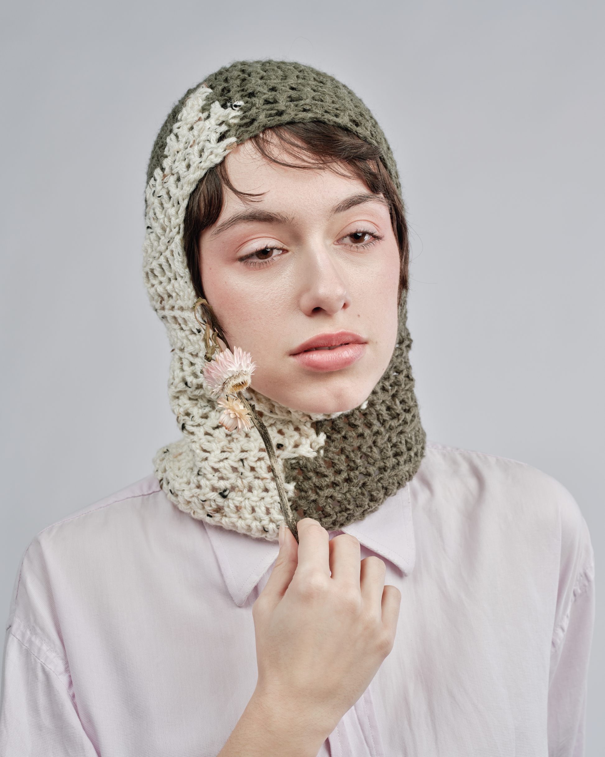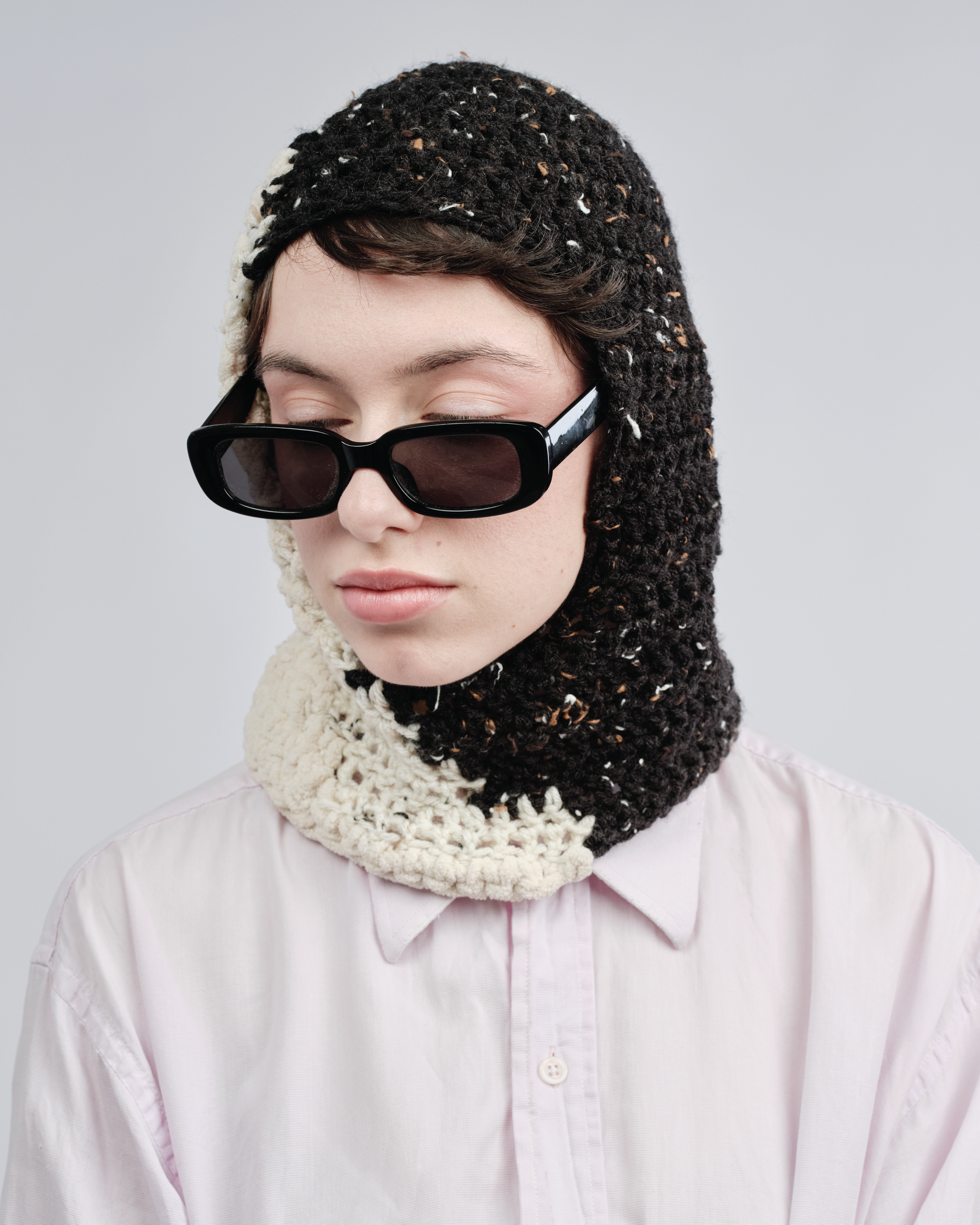 Made with three different types of yarn creating a colored asymmetrical pattern with a detailed surface texture. It has a fitted fit, and can be worn as a balaclava and as a neck warmer, hood down