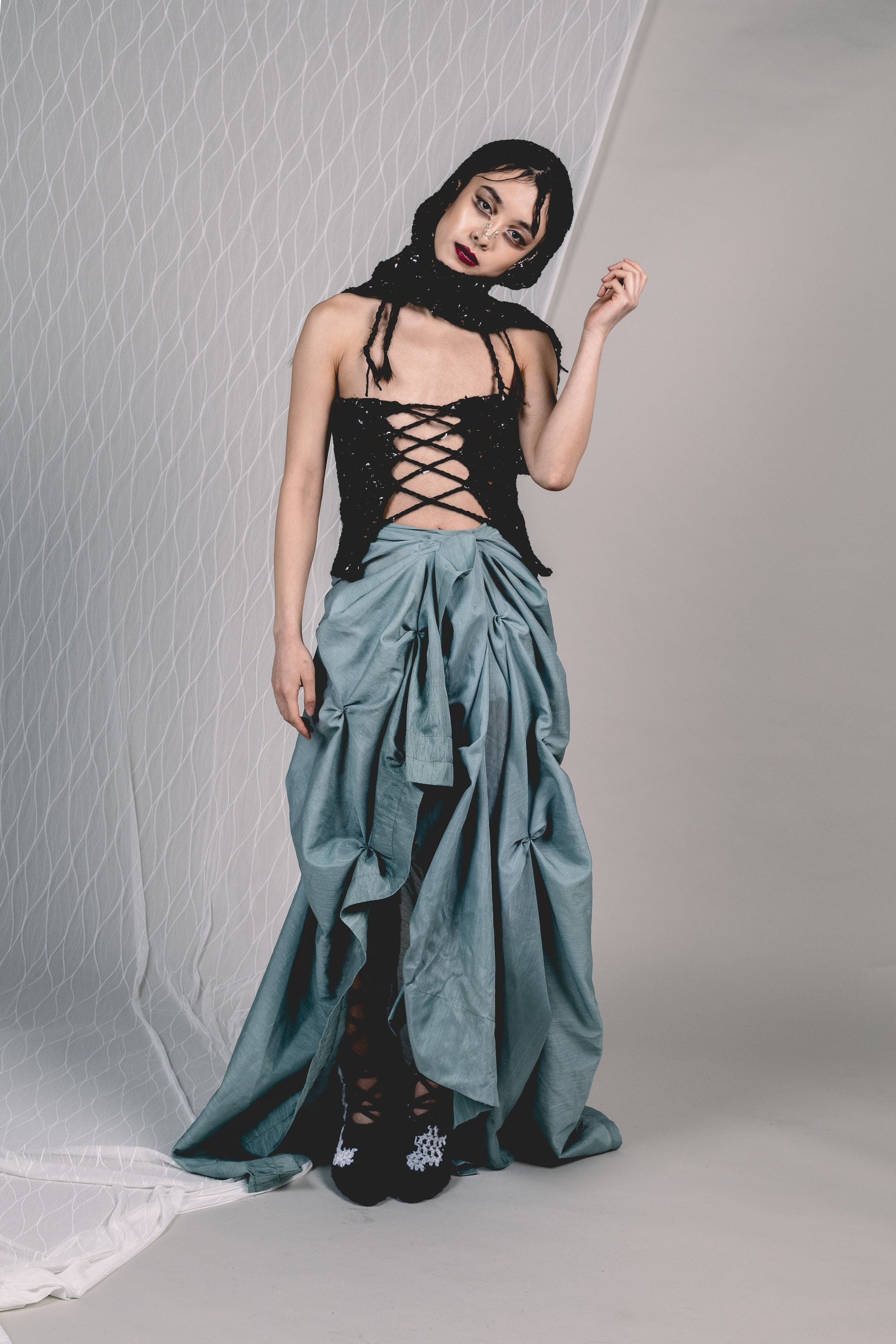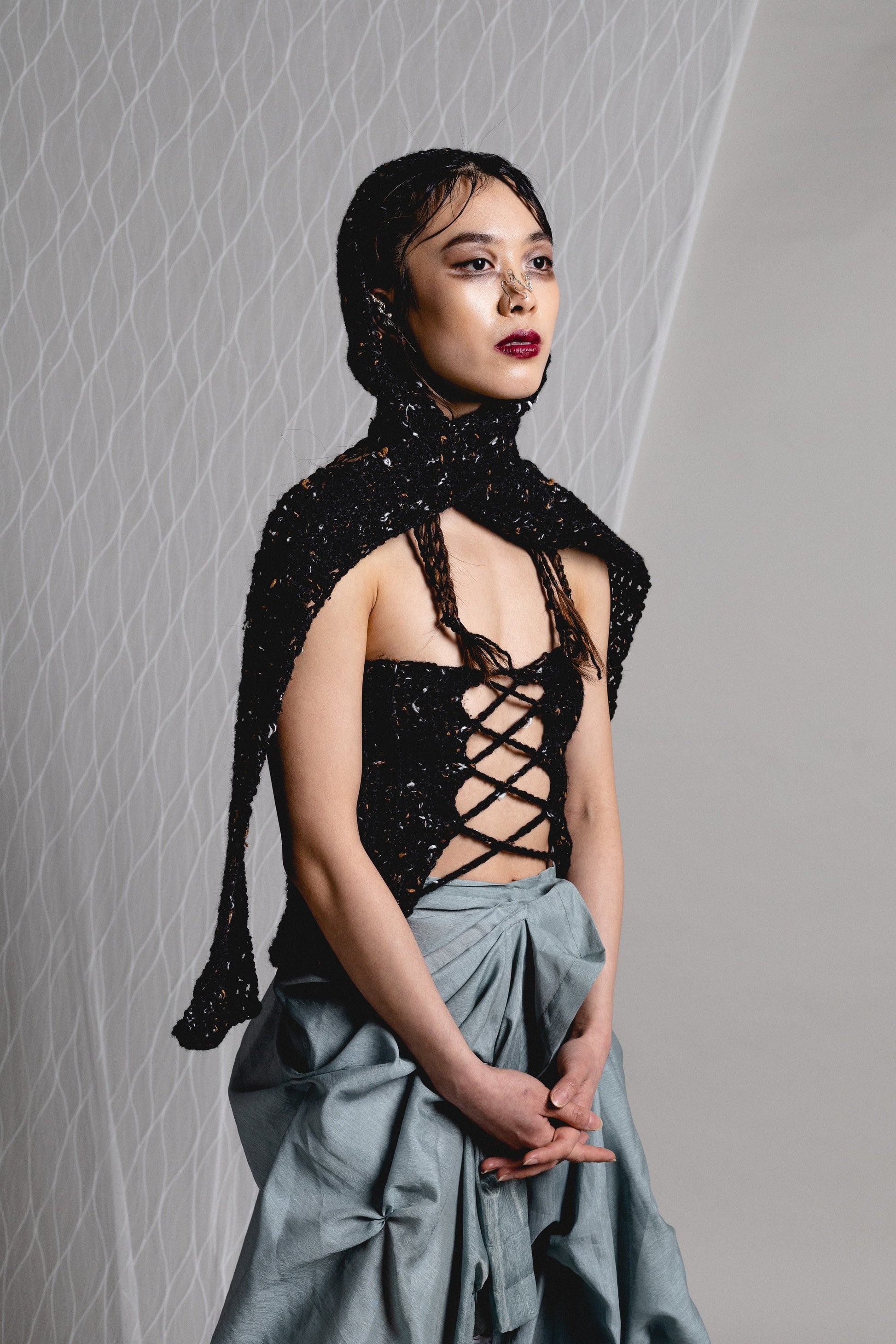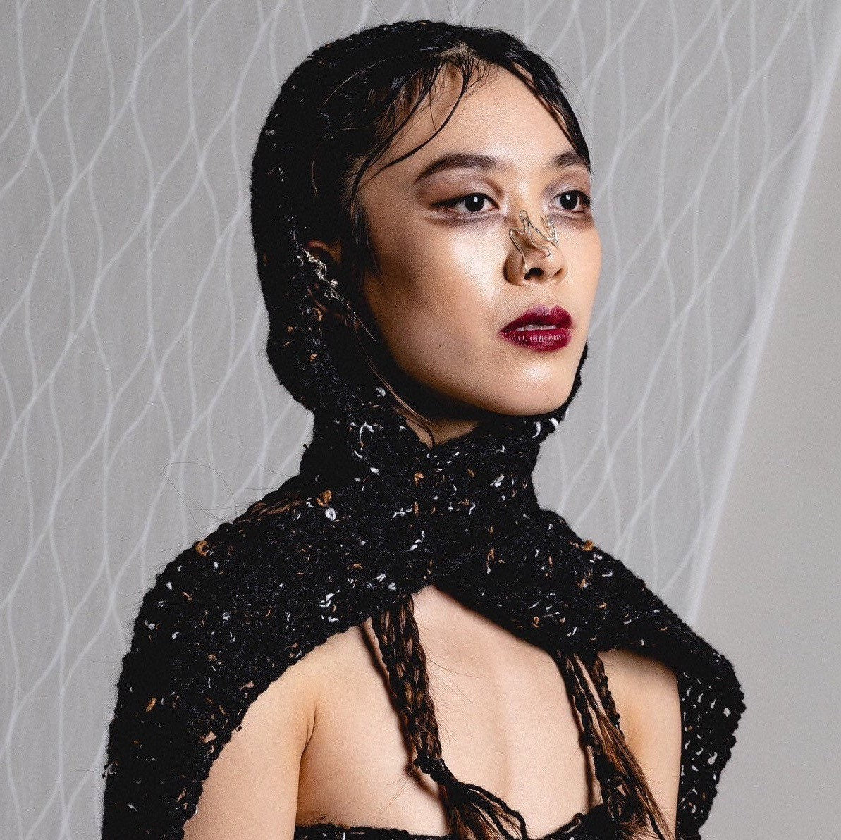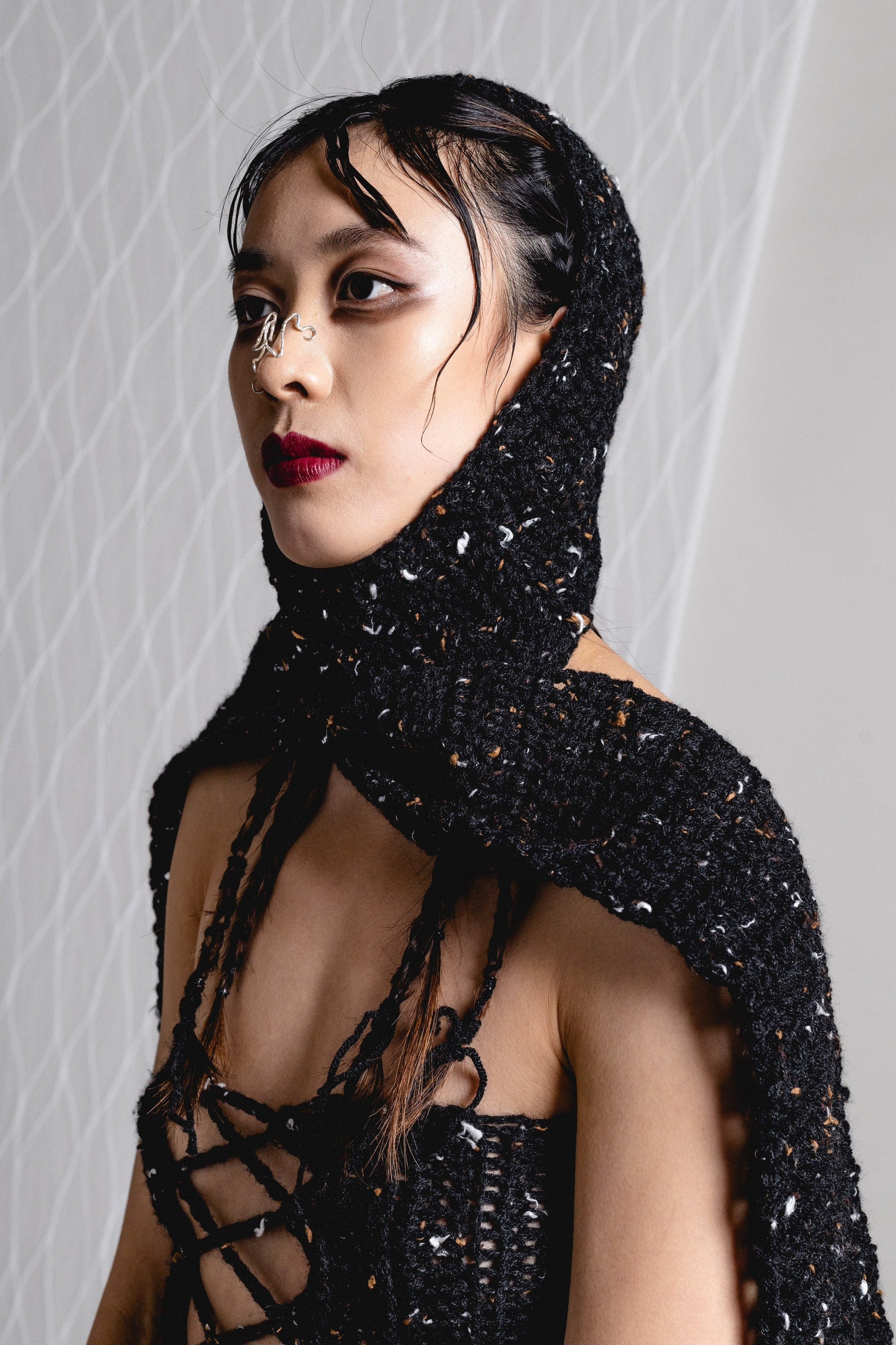 Handmade with fleck yarn. It has two long tails to use it as a scarf