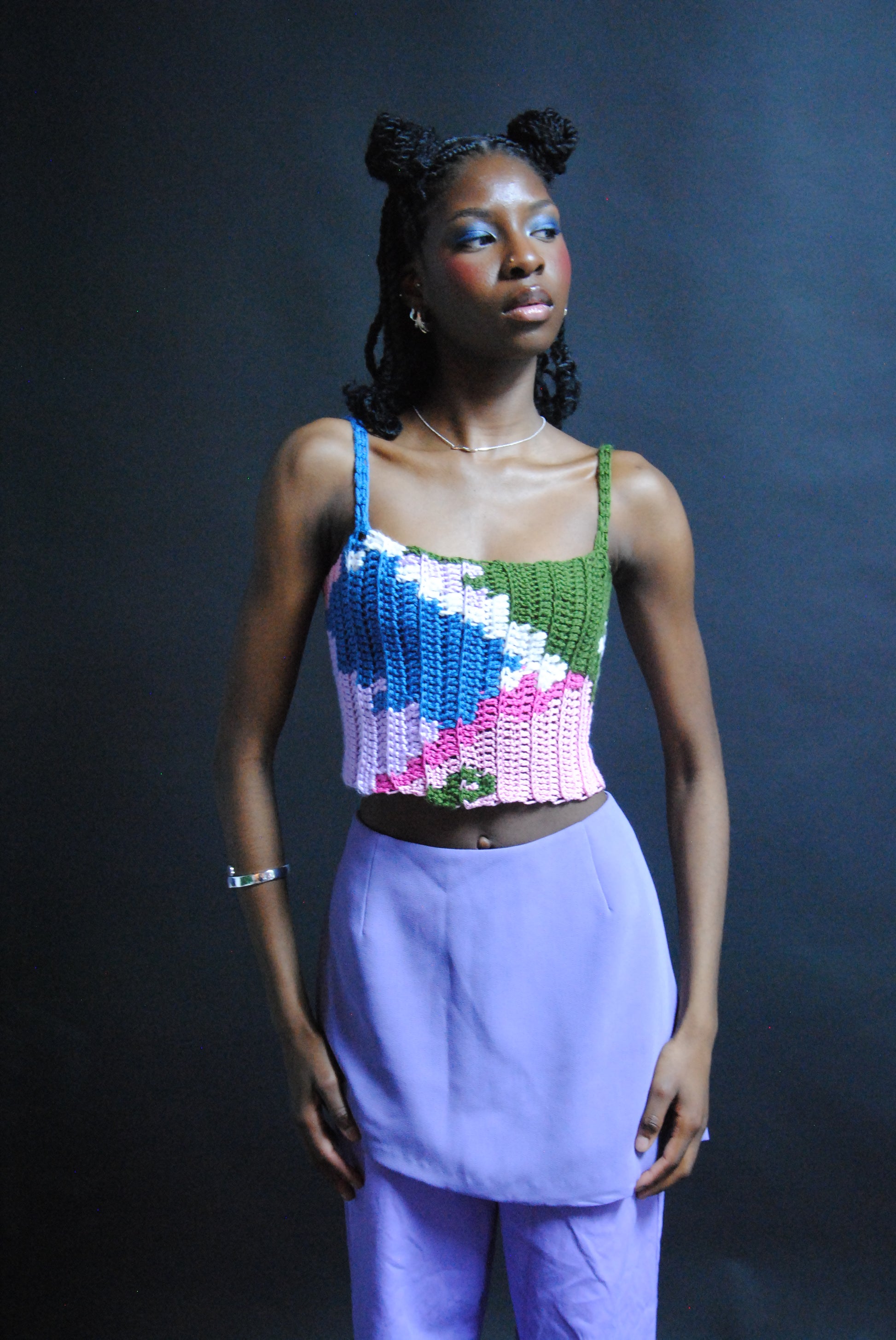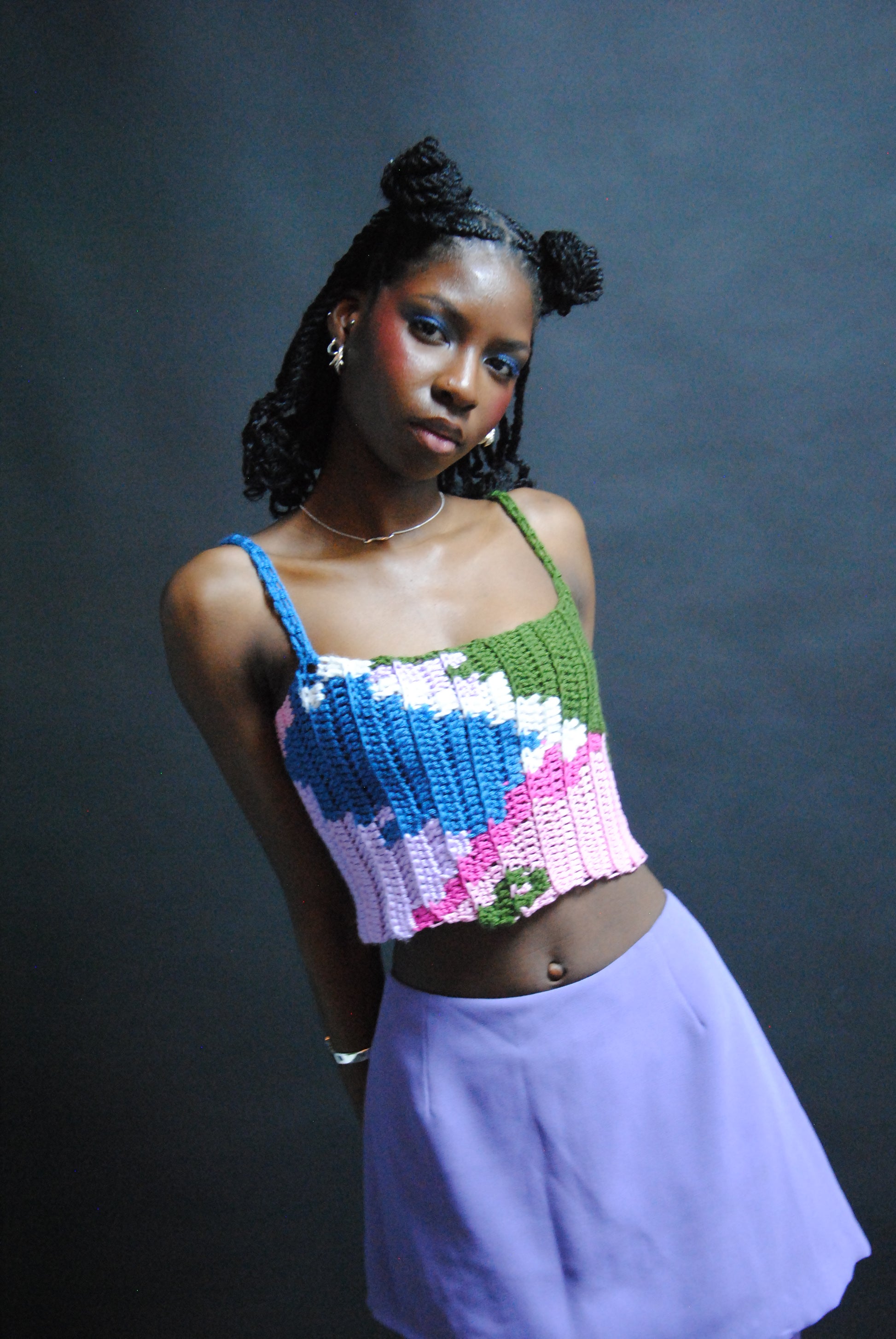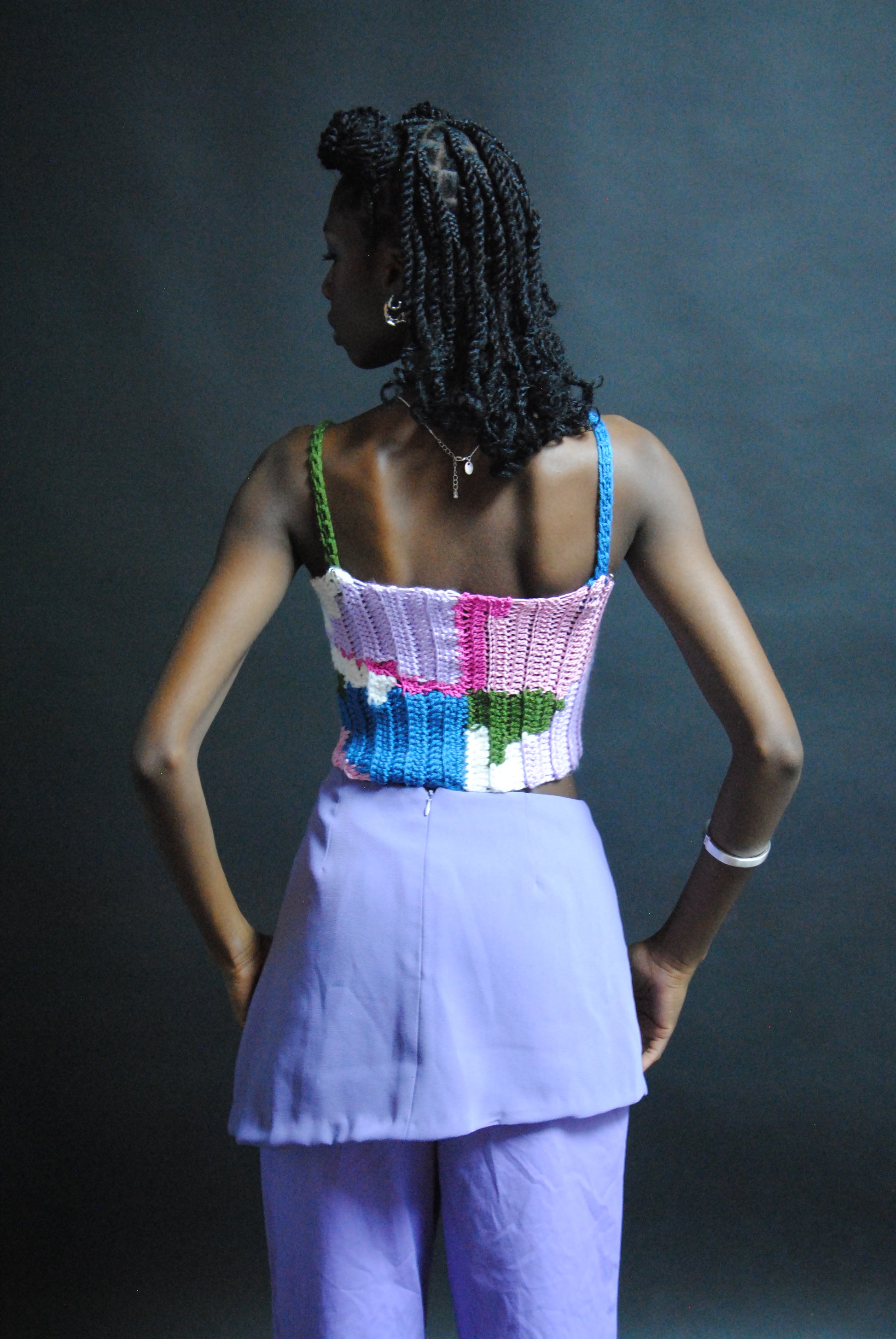 Made with different materials and colors of yarn, creating a funky organic pattern.