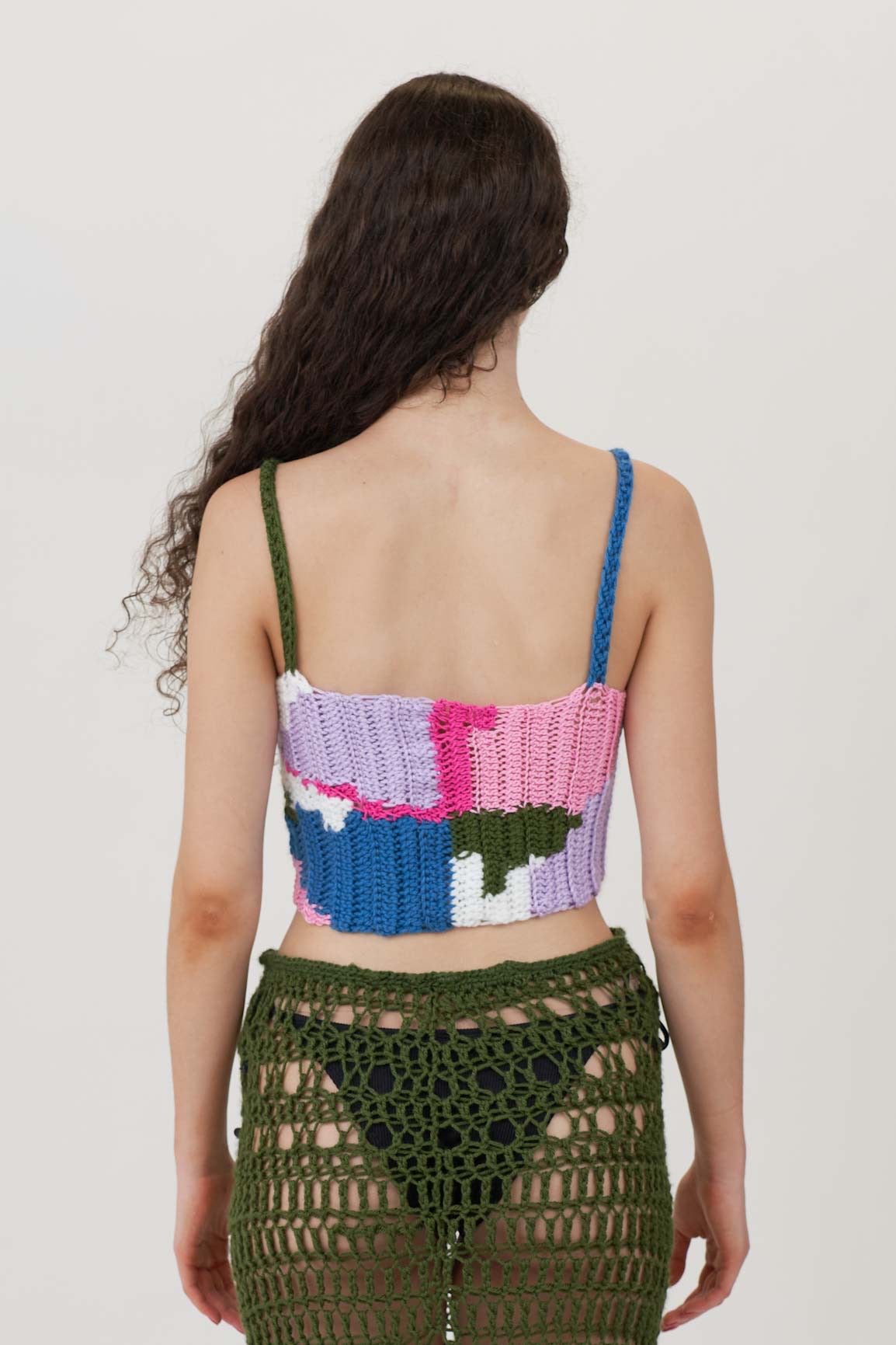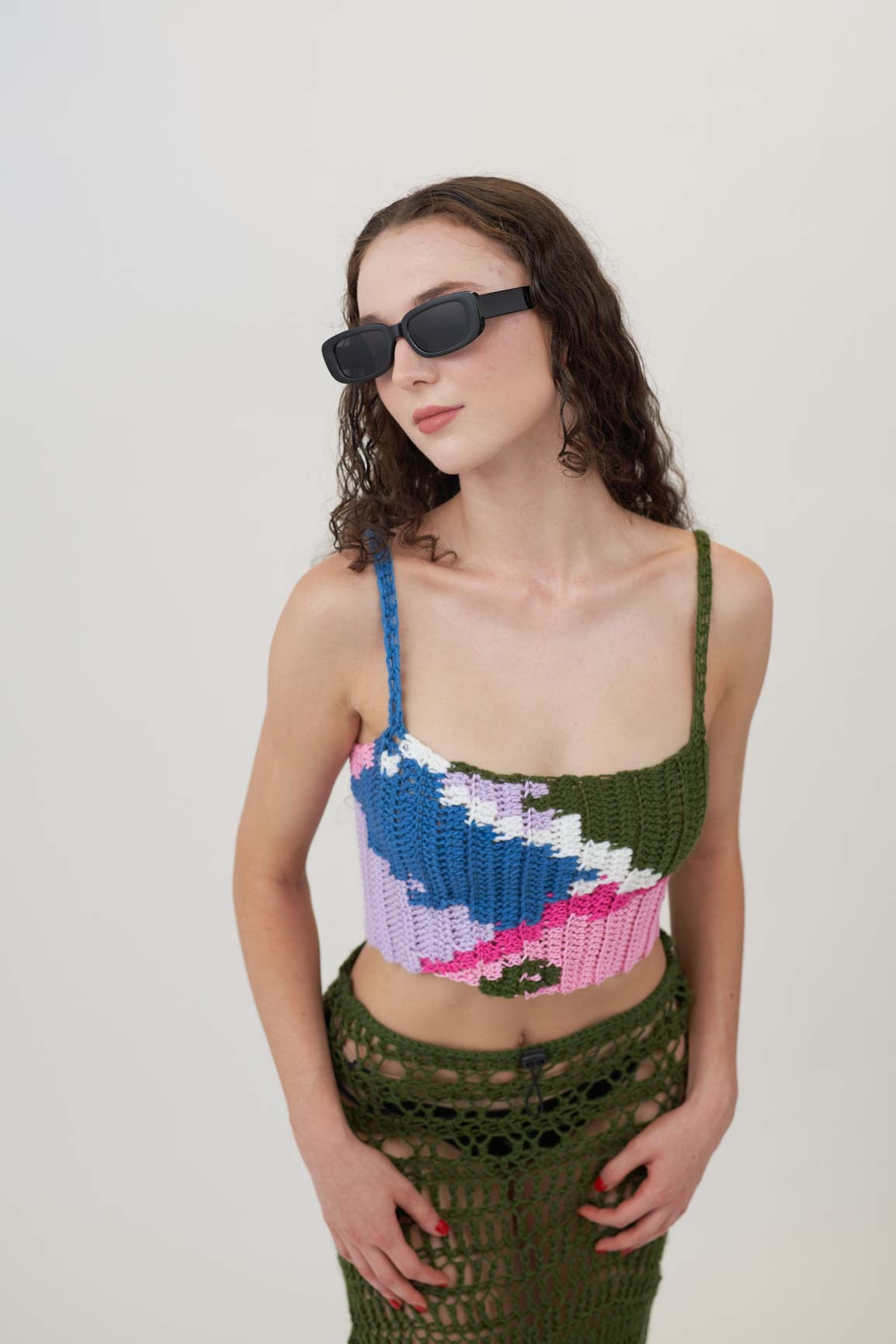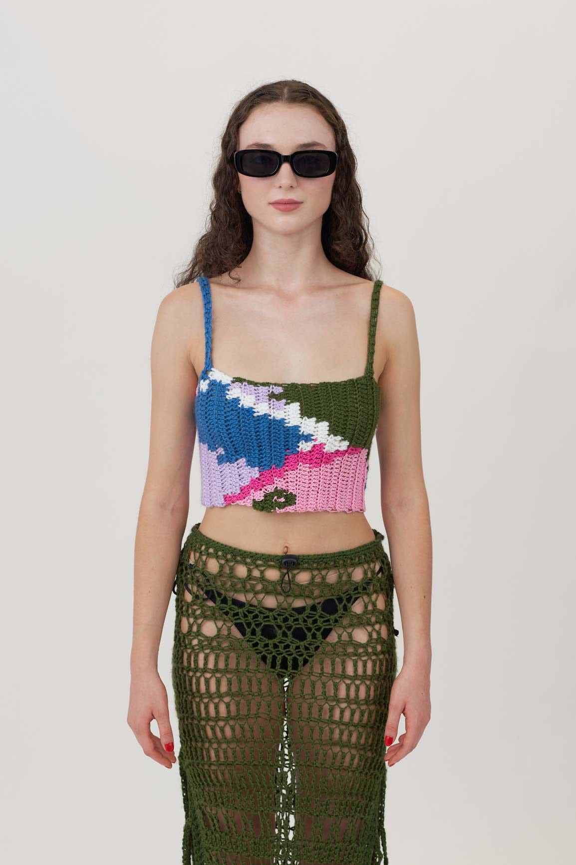 Made with different materials and colors of yarn, creating a funky organic pattern.